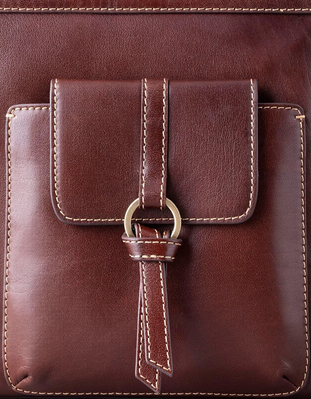 - Front slip pocket secured by front flap with Lakeland Leather o-ring and magnetic snap