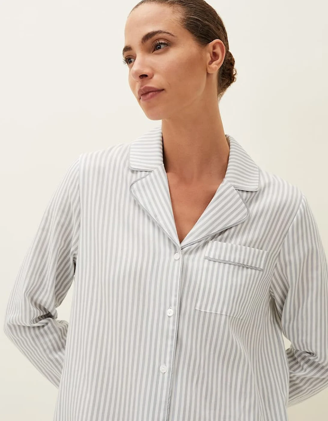 The perfect style for a goodnight’s sleep, our 100% cotton nightshirt is both light and breathable. Designed in a relaxed fit with a classic stripe print, this style has features piping, a single patch pocket, a working value placket and is finished with a curved hem. All of our pyjama styles come with a matching eye-mask and scrunchie in a self-tie bag. Model wears UK Size 10 and is 5’9/180cm Regular Fit