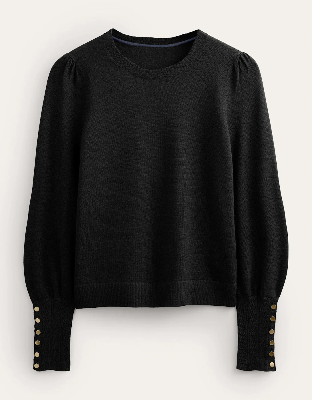 Button Cuff Merino Jumper.Black.This supersoft 100% merino wool jumper was created with detail in mind – like the exaggerated valueed cuff and the subtly puffed shoulders.