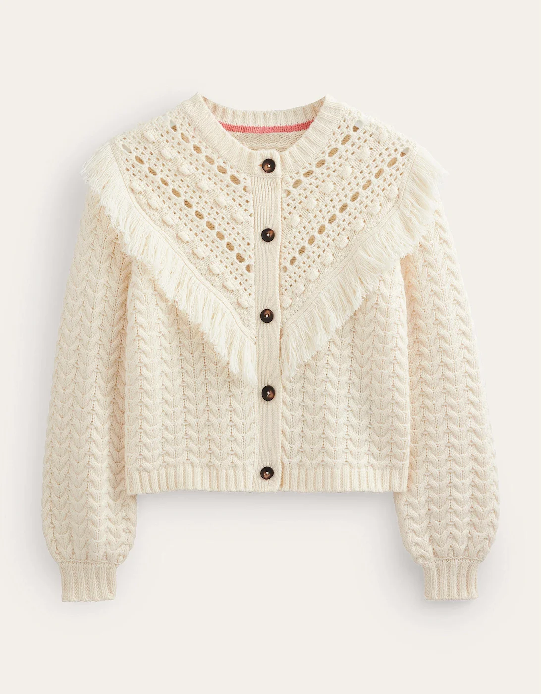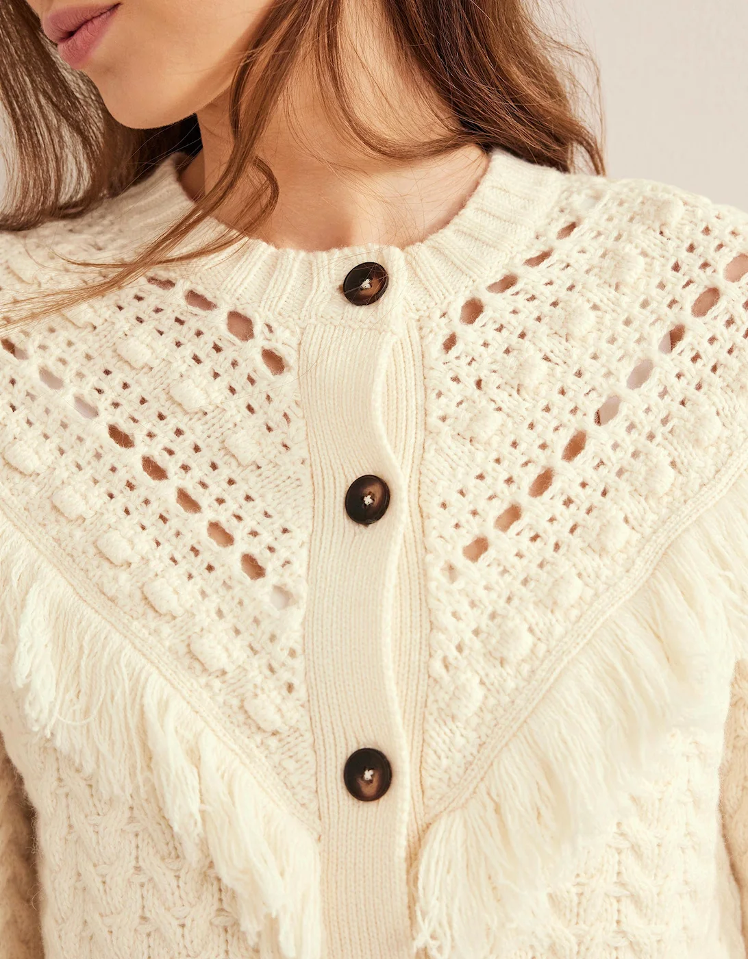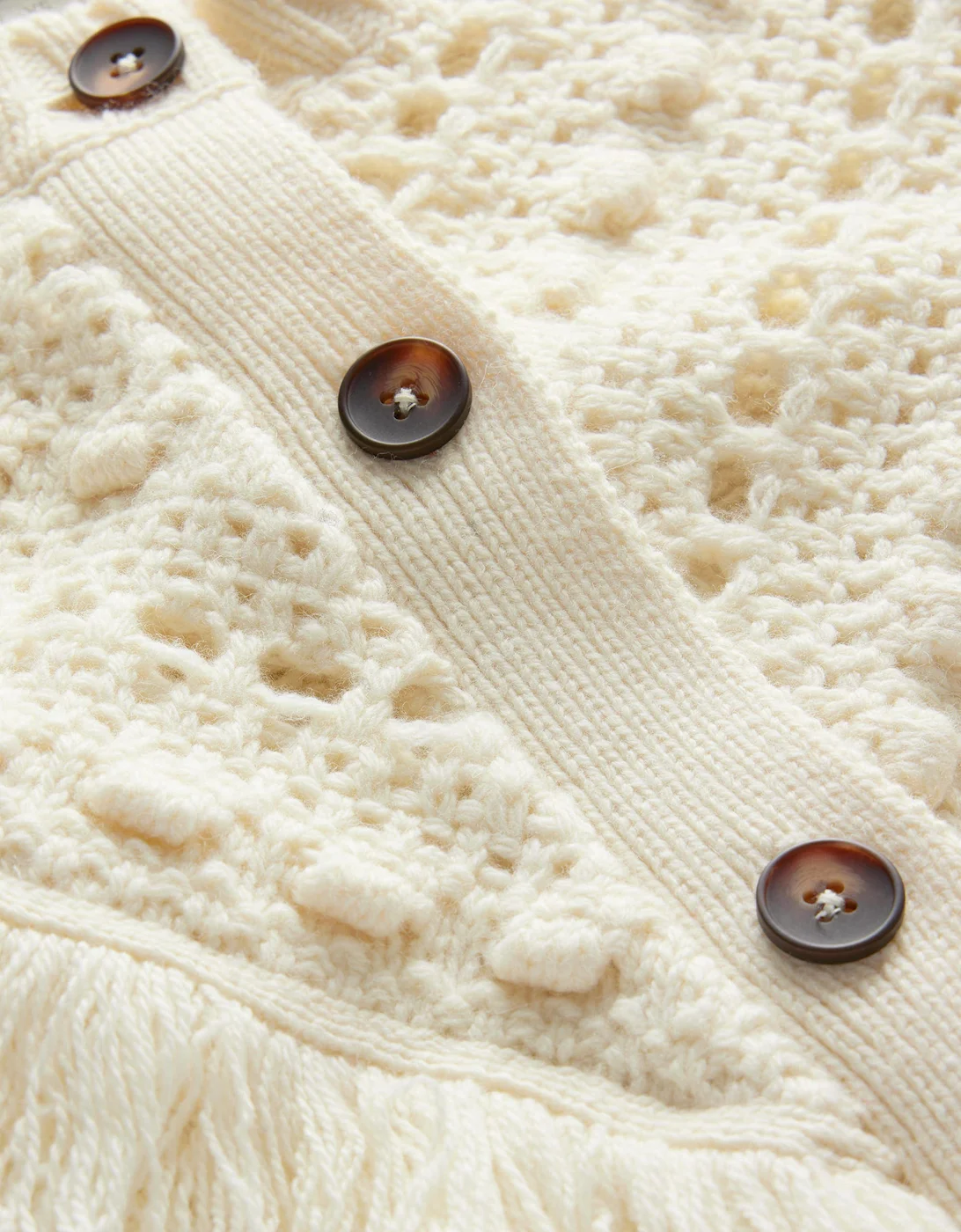 Fringe Detail Cardigan.Ivory.Texture does the talking with this chunky cable-knit cardigan, detailed with fringing and pointelle trims.