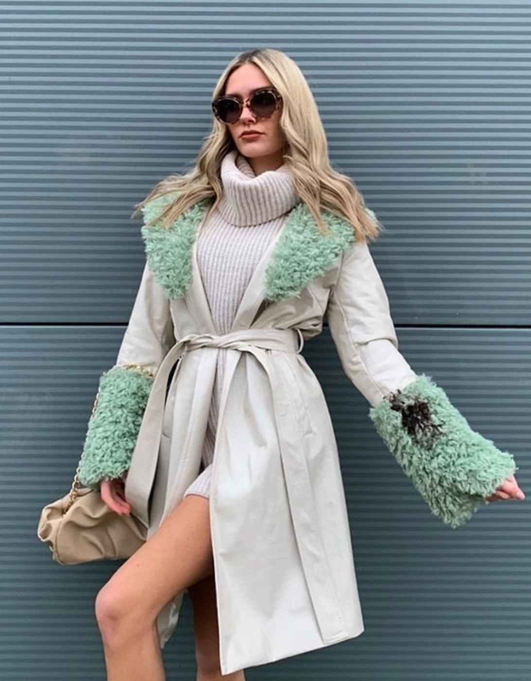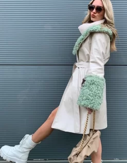 The most gorgeous faux suede coat with faux shearling detailing. We know you’ll be obsessed! Our faux suede coat with subtle check print features luxuriously soft faux shearling cuffs and a collar with a belt and side pockets.