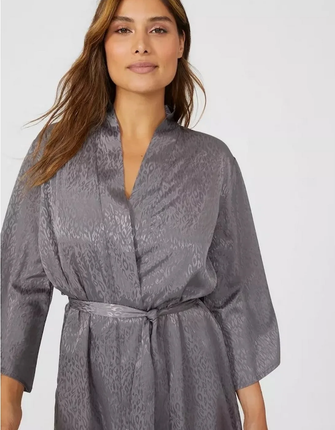 Material: 100% Polyester. Fabric: Jacquard, Satin, Soft Touch. Design: Animal Print. Fit: Tailored. Cinched Waist, Wide Sleeves. Sleeve-Type: Long-Sleeved. Neckline: V Neck. Fastening: Tie Belt.