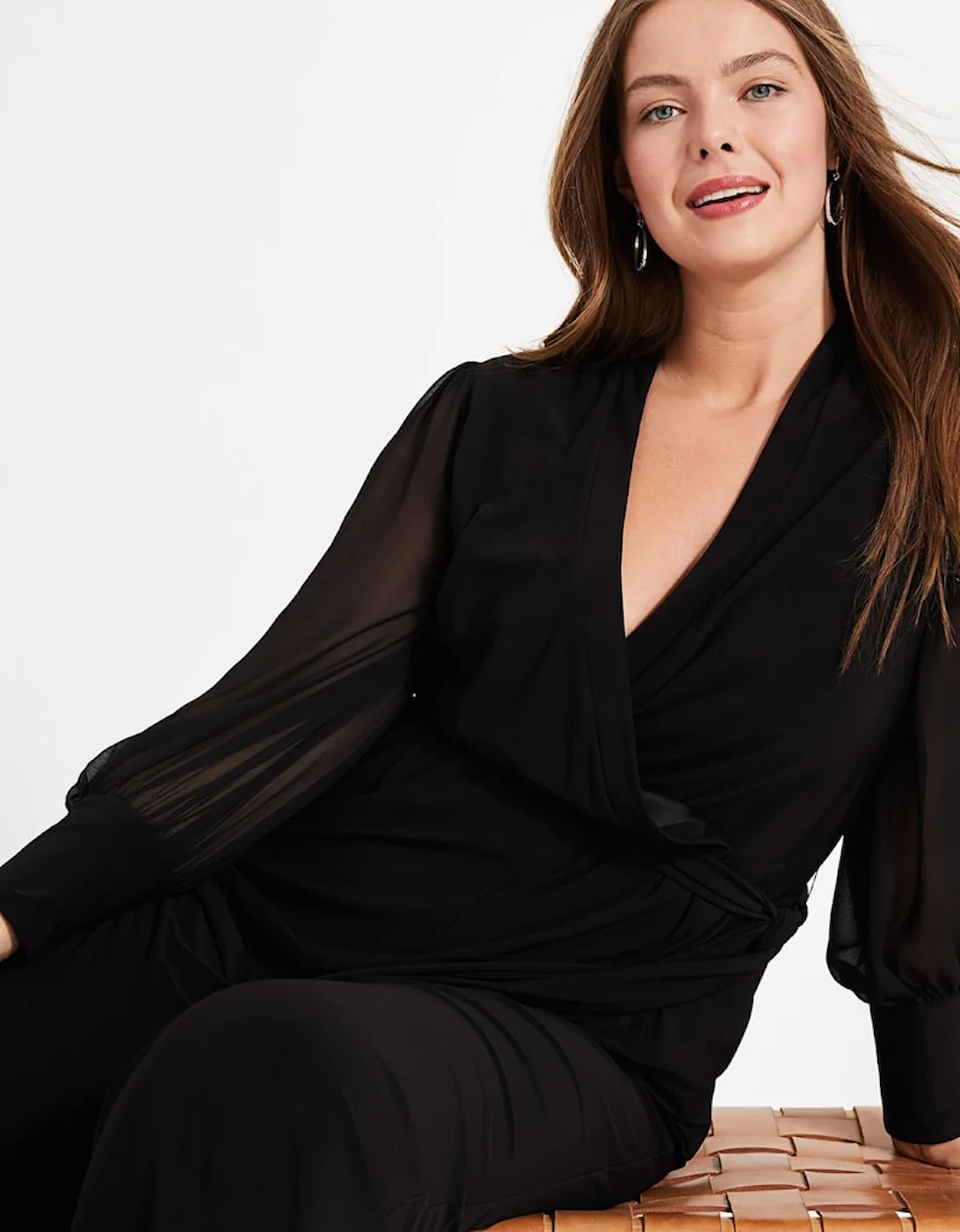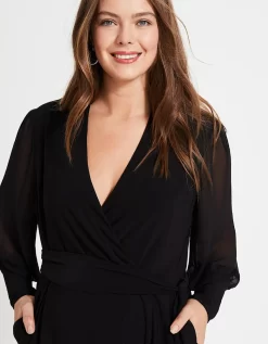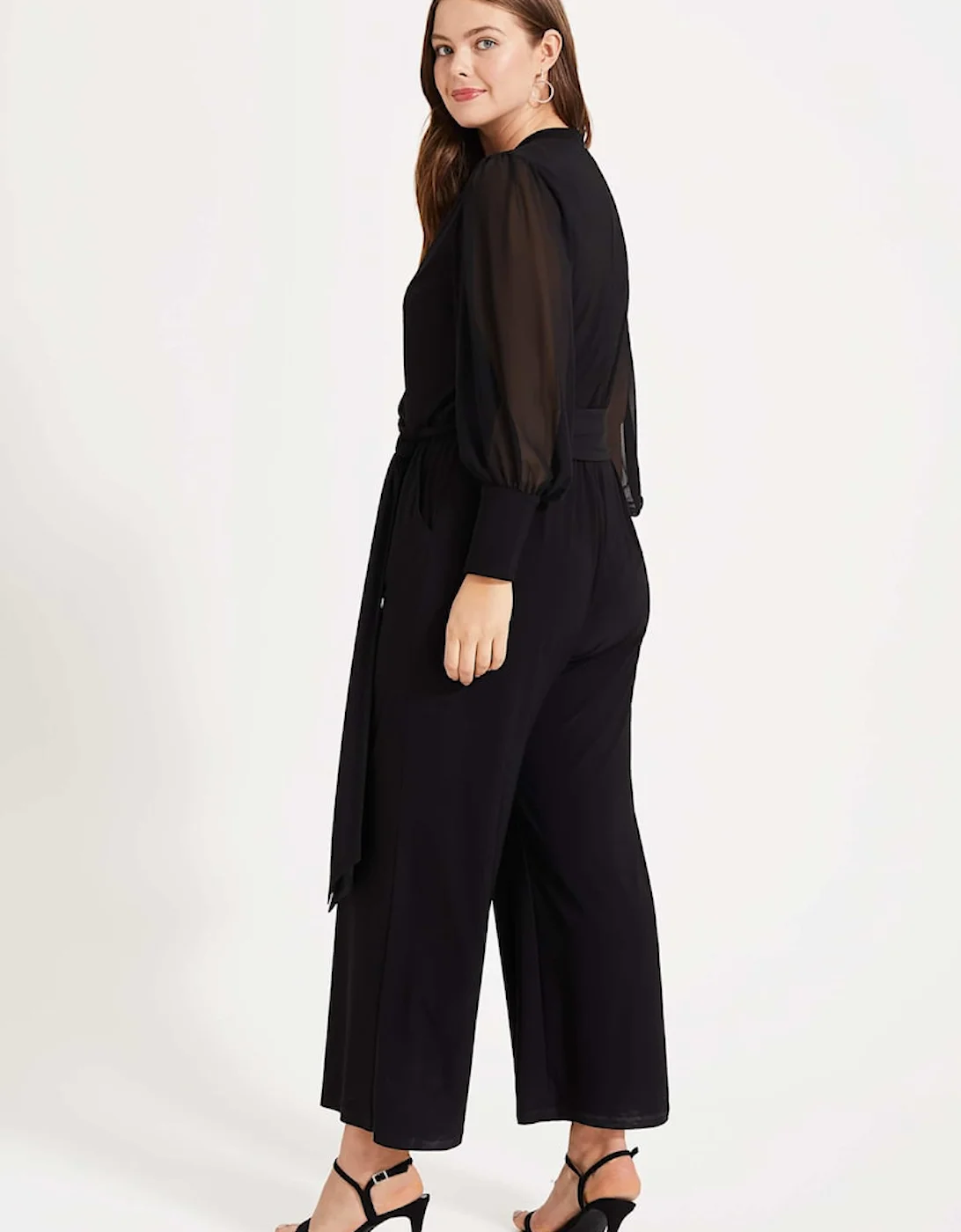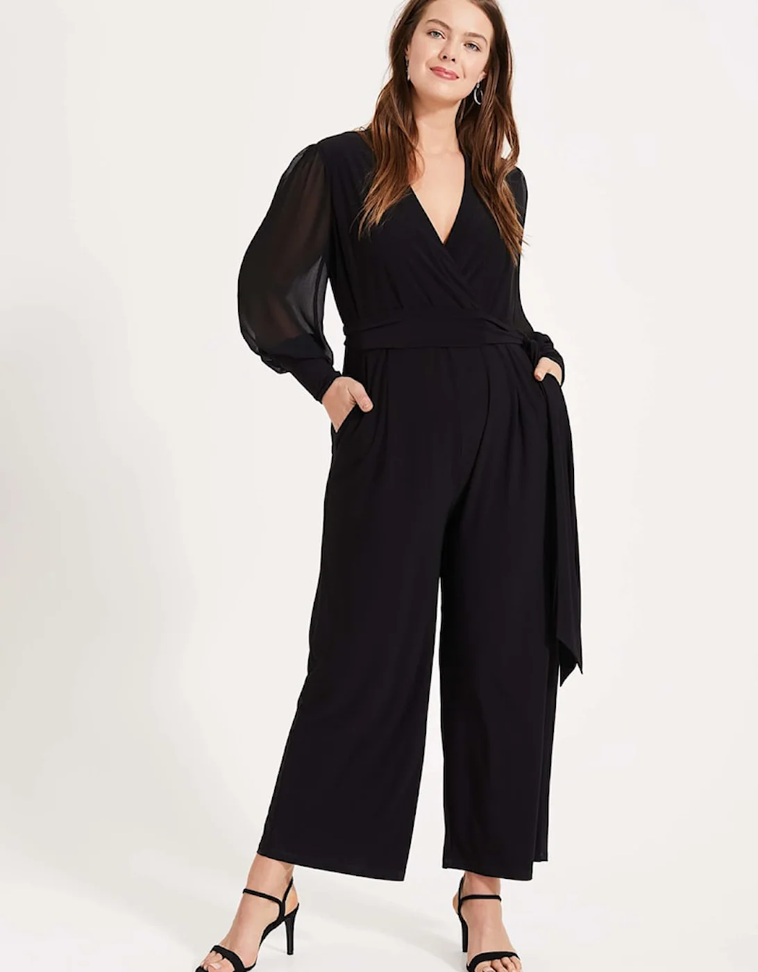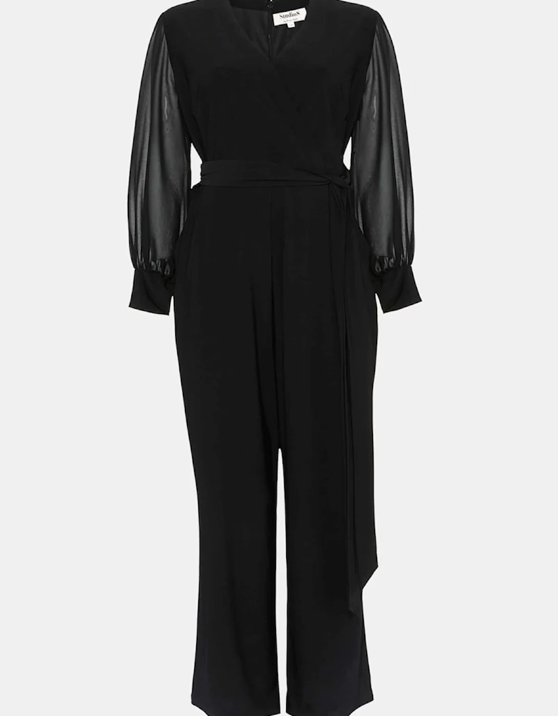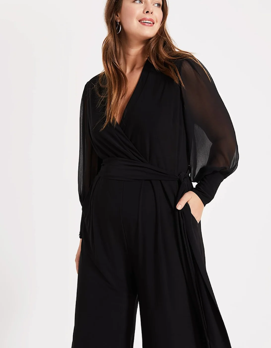 Studio 8 by Phase Eight: Premium plus size style. No need for a dress to impress. This effortless evening jumpsuit was inspired by our bestselling Denver Wrap Top. We love the long, semi-sheer blouson sleeves and wide-leg cut for a contemporary silhouette. Model wears UK size 16 and is 5’11 / 180cm Regular Fit