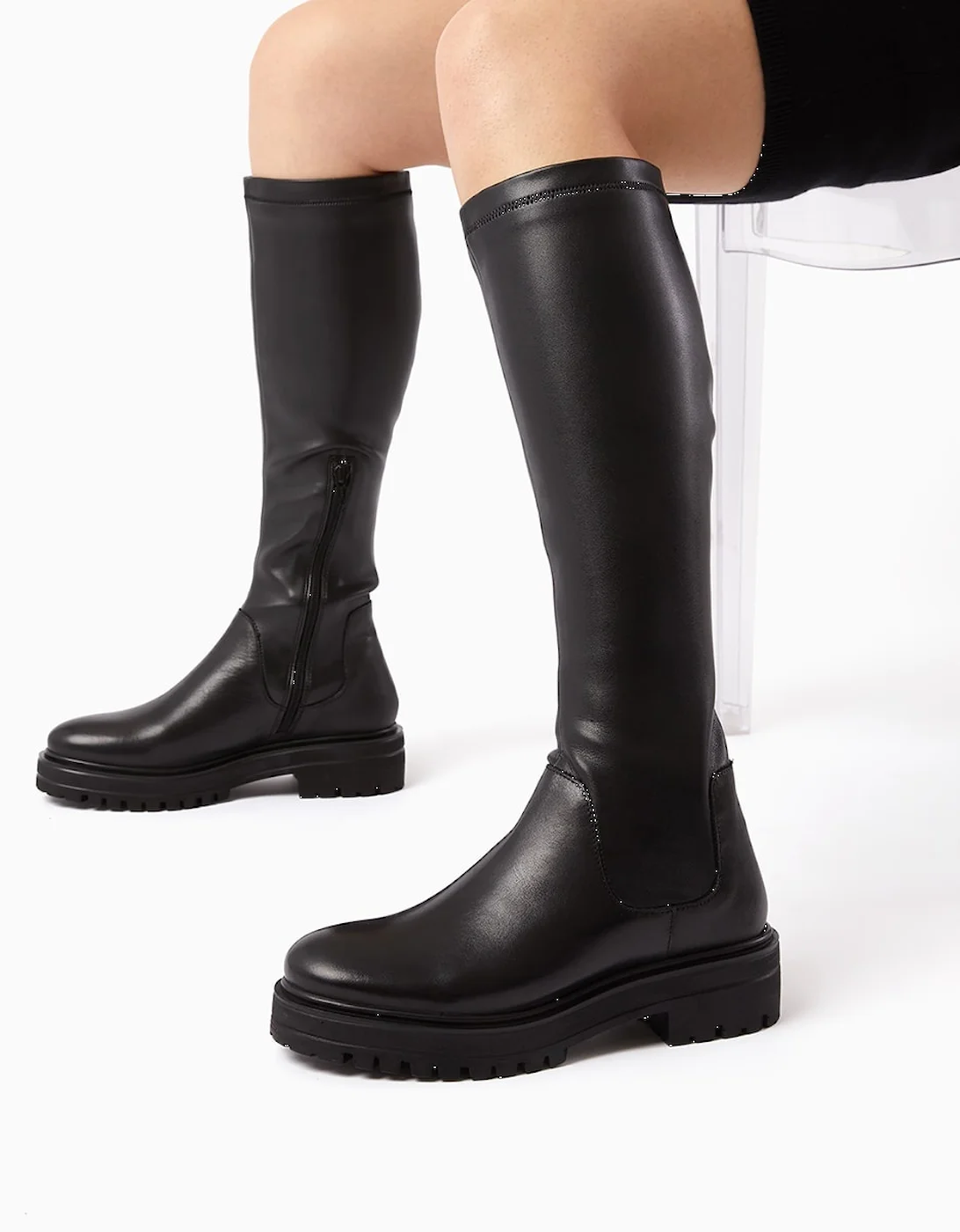 Our Tyren boots are ticking a lot of style boxes for the new season. Made from a durable stretch leather that flatters and fits the leg the light weight chunky sole makes them a cool and comfortable choice., Material: Leather.