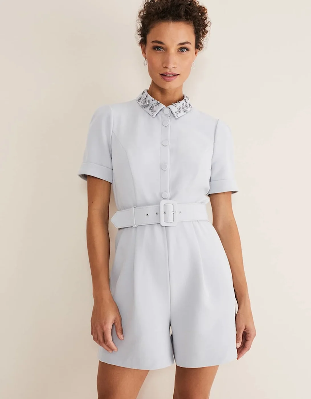 The perfect occasion playsuit. Designed in a soft baby blue shade, our Etta playsuit features a statement embellished collar, seam and covered value down detailing, a matching covered belt and handy pockets. Style with matching heels and a clutch. Model is Size 10 5’9/ 175cm Regular Fit