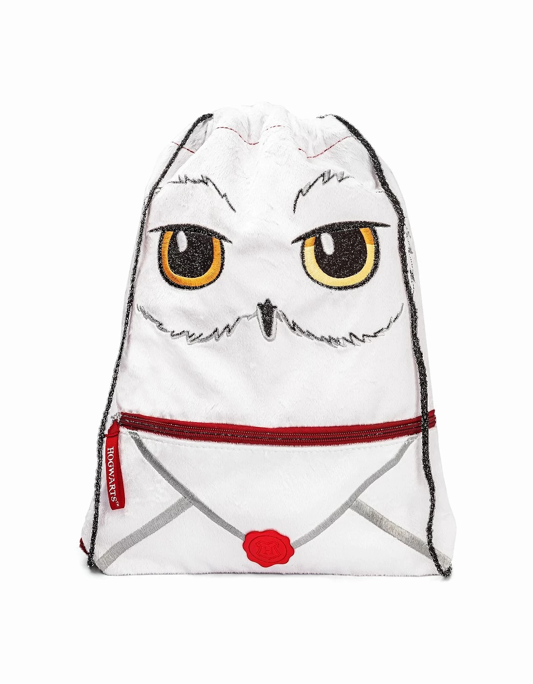 100% Polyester. Fabric: Plush. Design: Embroidered, Hogwarts, Seal. Fastening: Drawstring. Branded Zip Pull, Faux Leather Badge. Compartments: 1 Main Compartment. Pockets: 1 Front Pocket, Zip. 100% Officially Licensed. Characters: Hedwig.