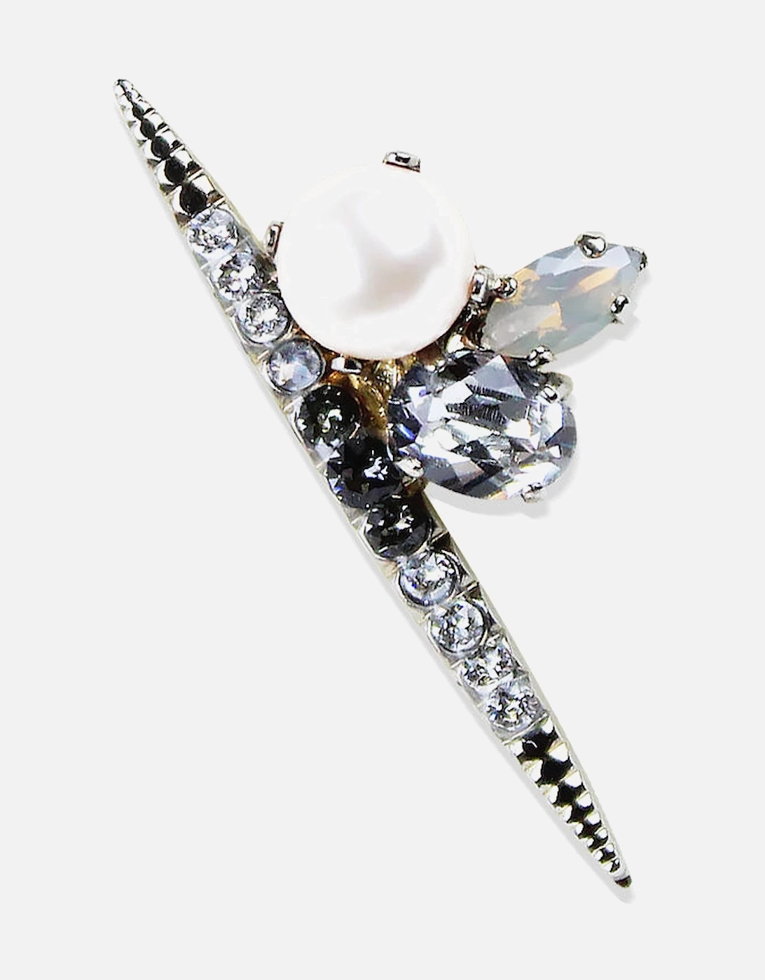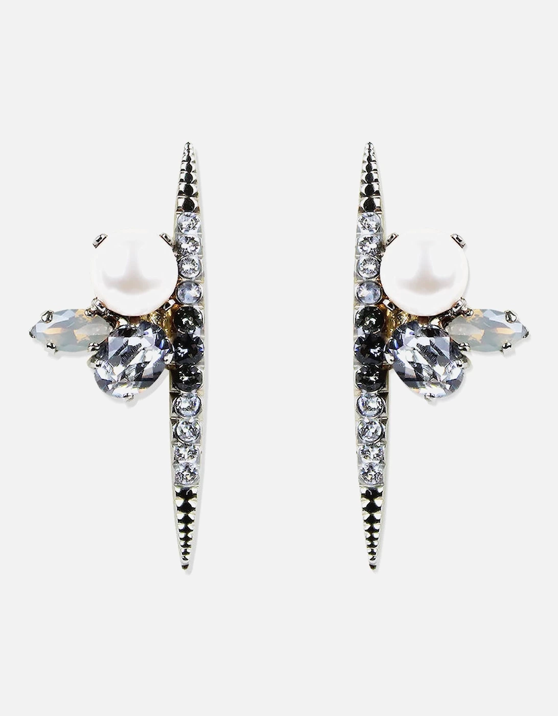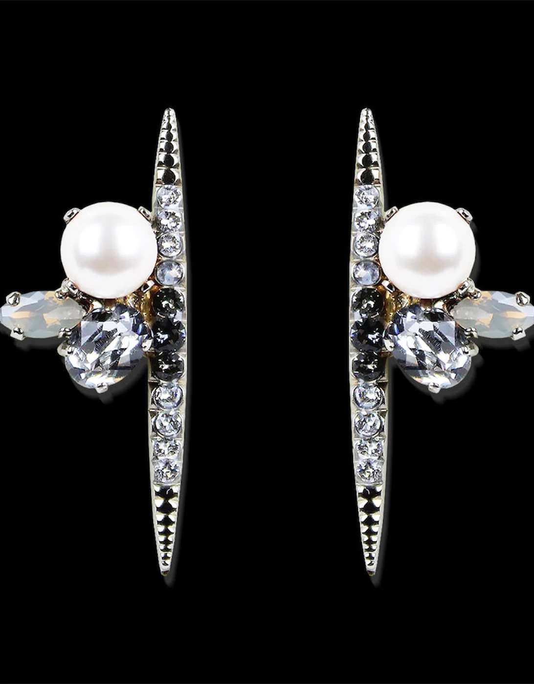 Signature spike element earrings by Heiter with Swarovski glass pearl. Clear, black diamond and light grey opal Swarovski crystal detailing. Designed and handmade in East London. For pieced ears only.