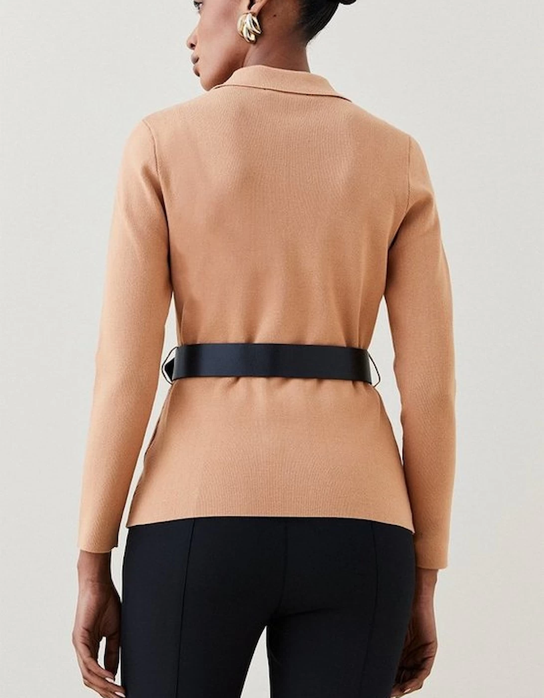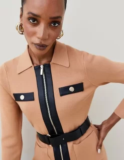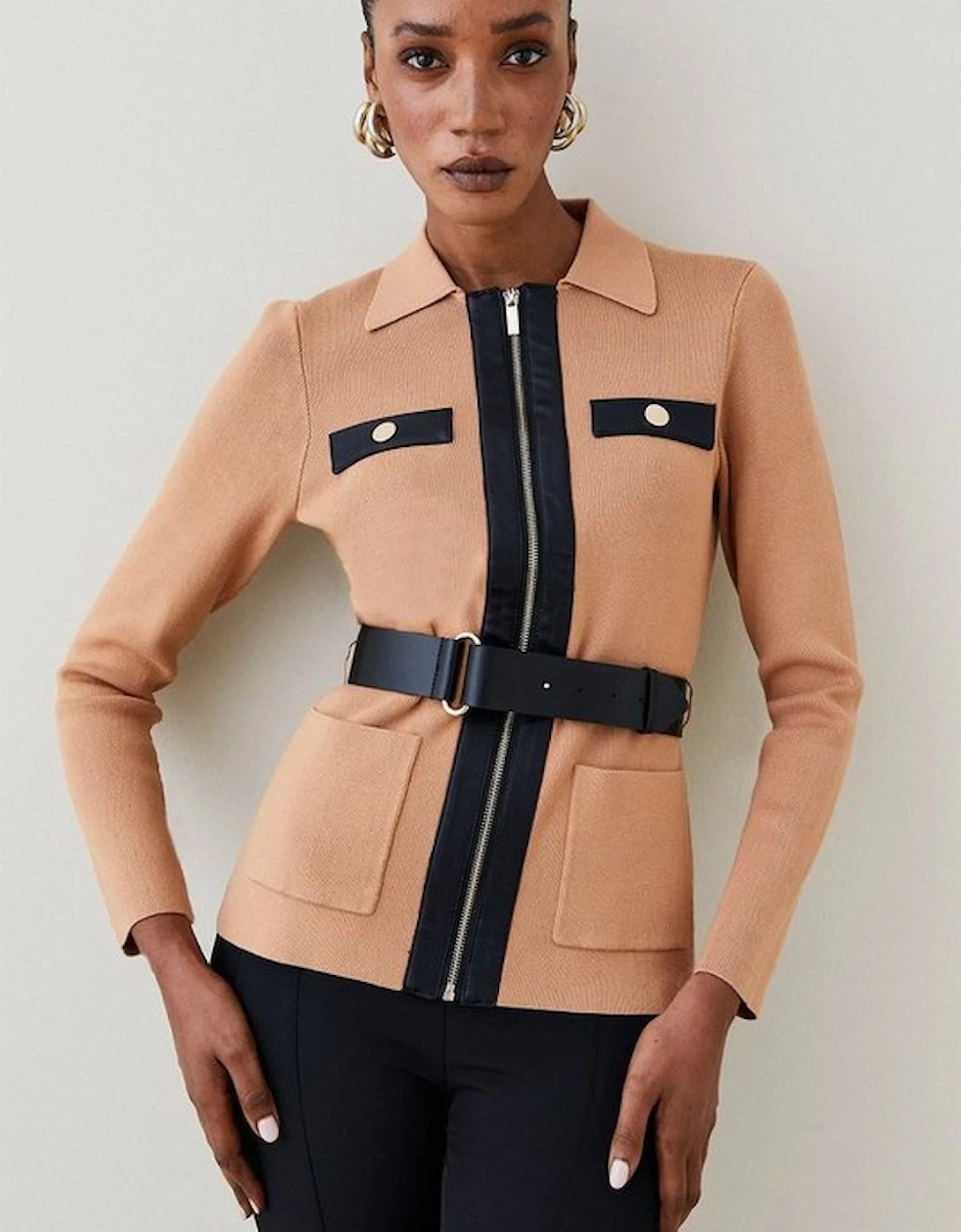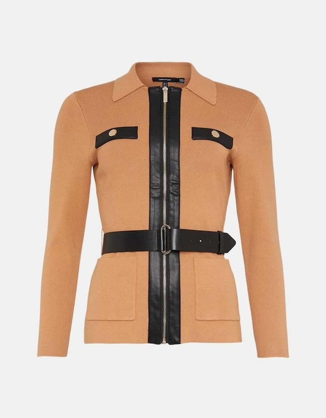 Designed for those who favour a demure sense of style, this luxe knitted jacket features faux leather trims and a front zip for a dash of daring finesse. Cut close to the figure and trimmed with a collar and patch pockets, it blends the practical with the polished. Tighten the utilitarian buckled belt to cinch in your waist when layering it over a ladylike pencil skirt . Style: Biker Jacket Design: Plain Fabric: Pu Length: Regular Neckline: Collared Sleeve Length: Long Sleeve This garment is part of our READY FOR THE FUTURE range It is made with responsibly sourced viscose, helping to protect our world’s forests. Find out more about our material goals Ready For The Future Guidelines