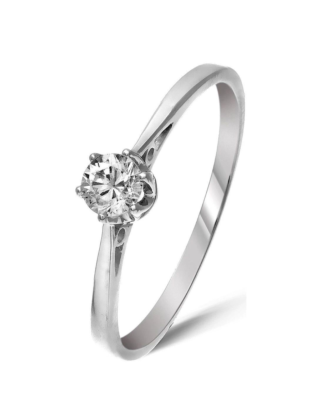 9 carat white gold, 25 point diamond (100 points = 1 carat), Bridged design, Solitaire diamond, 6 claw setting, Available in sizes J-R, 9 Carat White Gold 25 Point Diamond Solitaire Ring