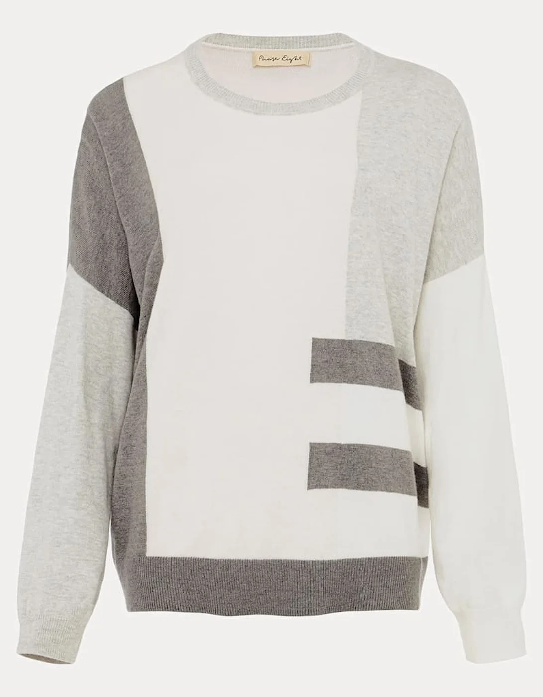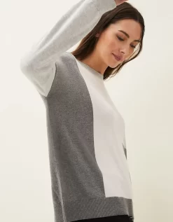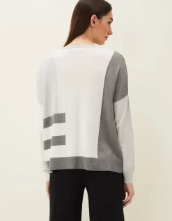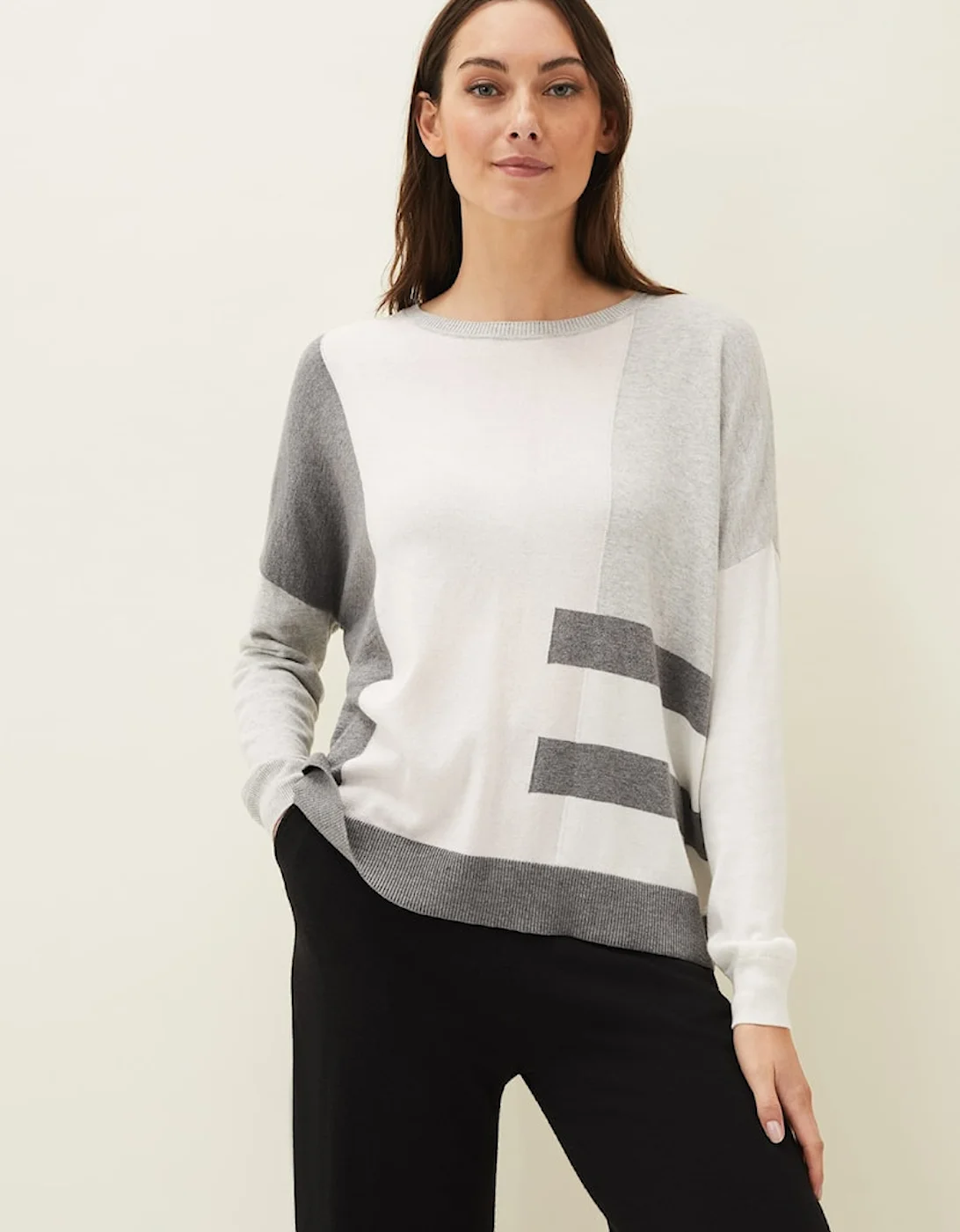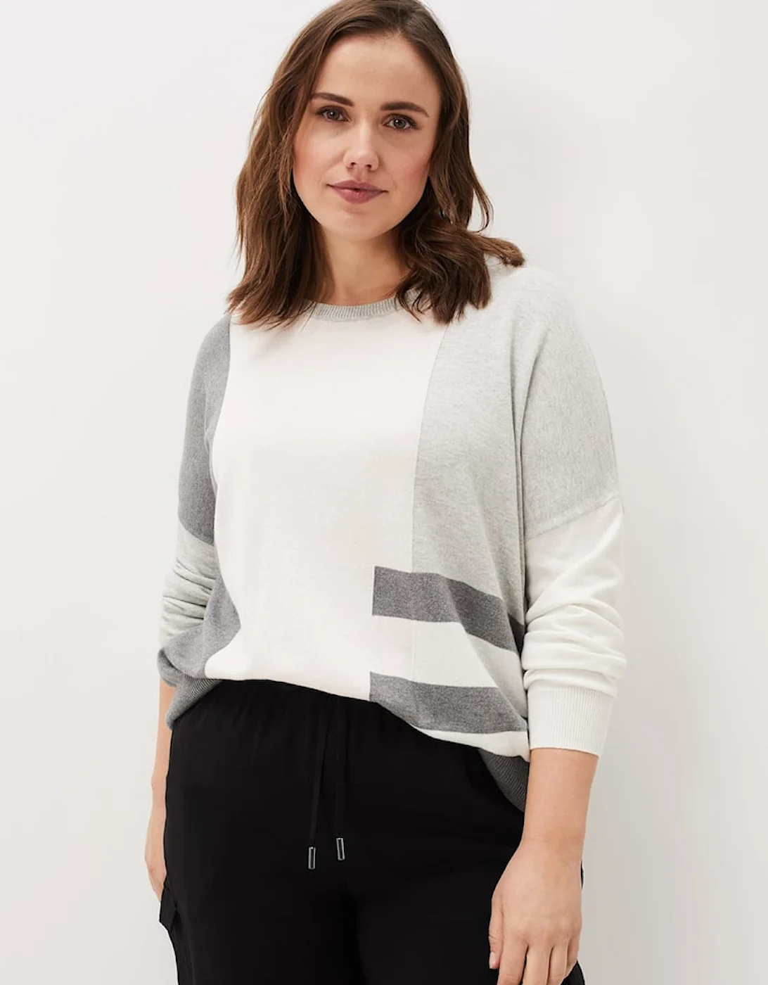 The colourblock design makes this soft fine knit jumper a bold addition to your wardrobe. Relaxed in fit, it pairs perfectly with our jersey culottes for a comfy off-duty look. Available up to size 26. Model wears UK Size 10 and is 5’9/175cm Regular Fit