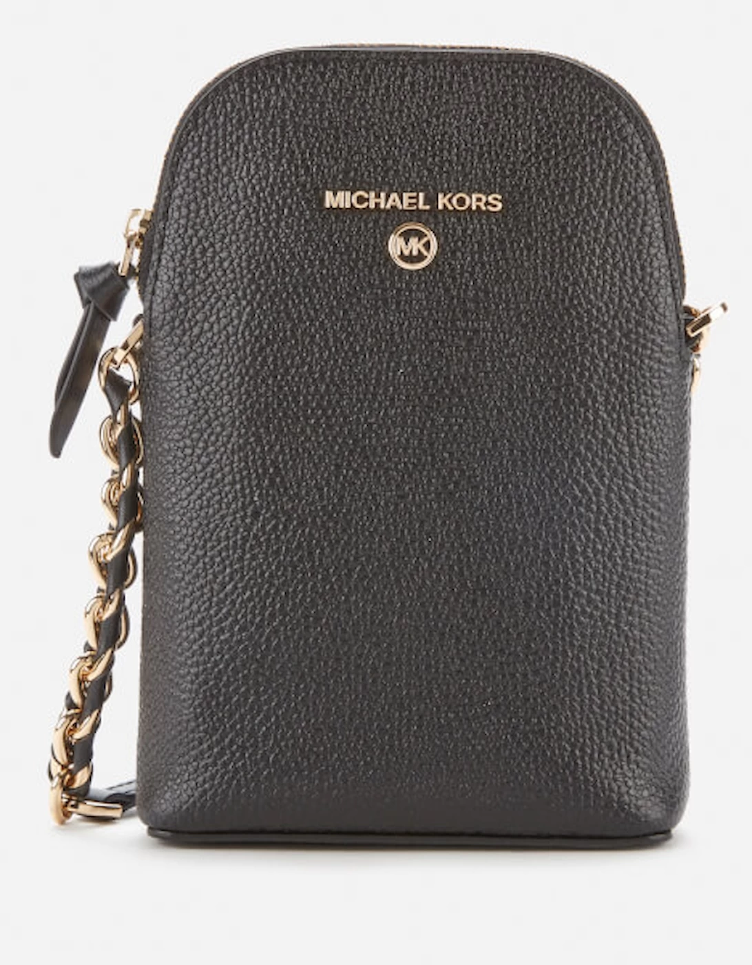 Compact MICHAEL MICHAEL KORS phone bag in black grain leather. The ‘Jet Set’ cross body has tan leather details and a zipped main compartment with enough room for a phone and four cards.