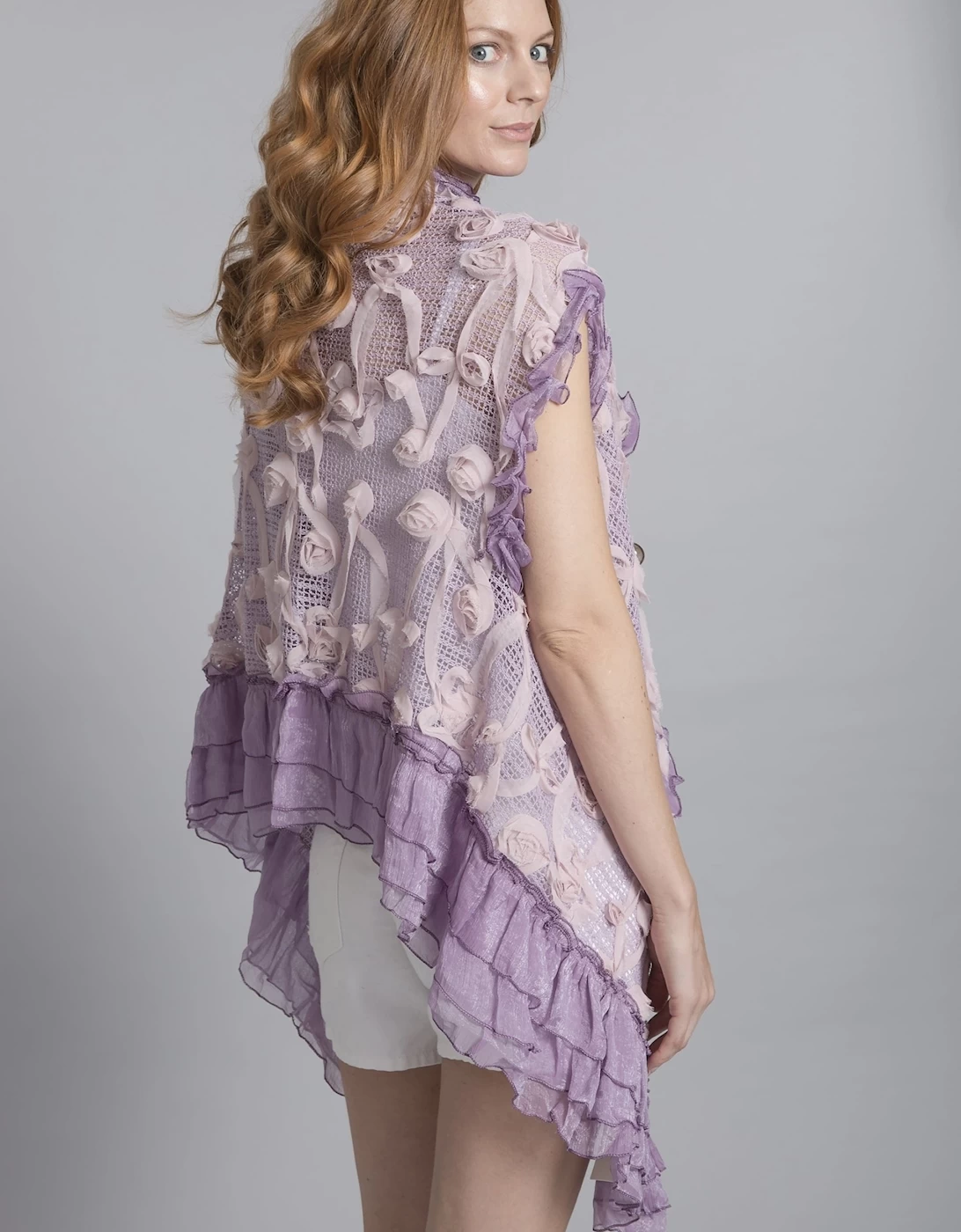 A sheer silk chiffon gilet with rose detail for an added wow factor.