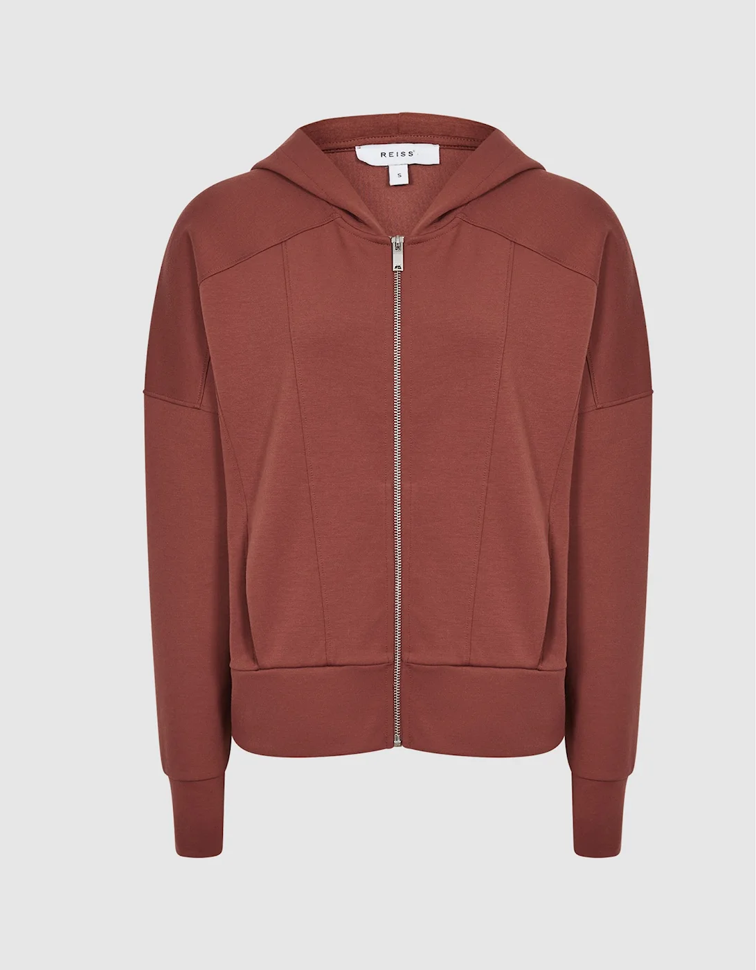 For expertly-crafted laid-back appeal, opt for the Nia hooded sweatshirt. It’s crafted from technical jersey that’s soft to touch, then fastens down the front with a silver-tone metal zip from neckline to hem. Wear it with separates for a casual mood.