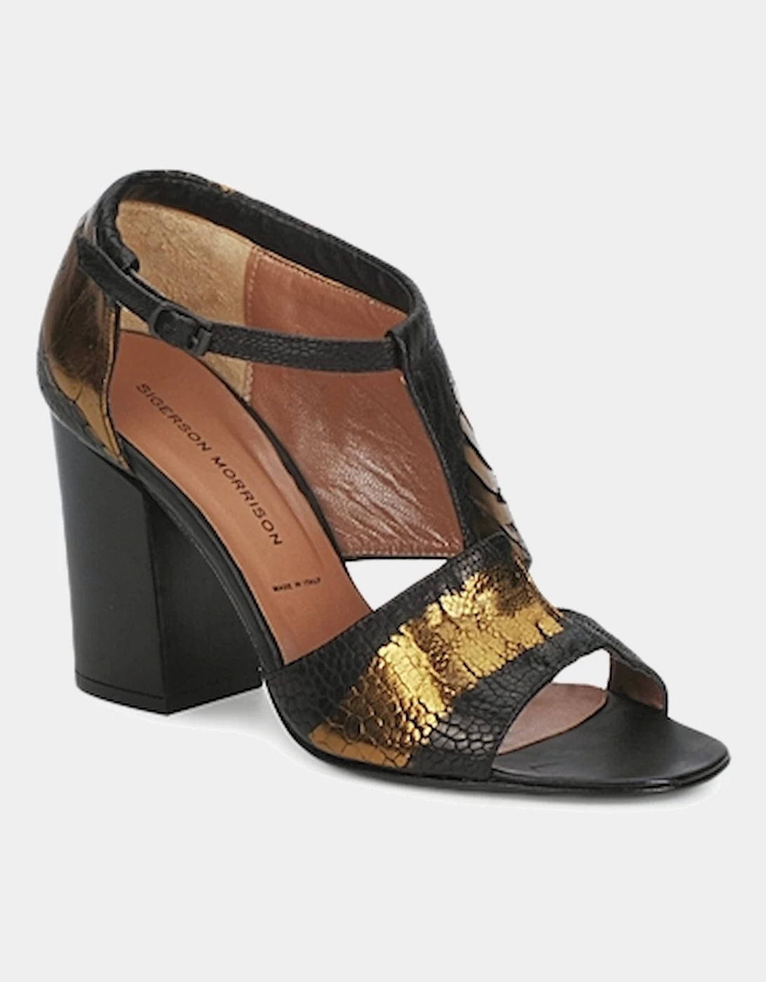 Sandals designed with a 9 cm covered heel. Glittery upper and contrasting leather bands for an elegant and graphic design. A model created by designer Sigerson Morrison.