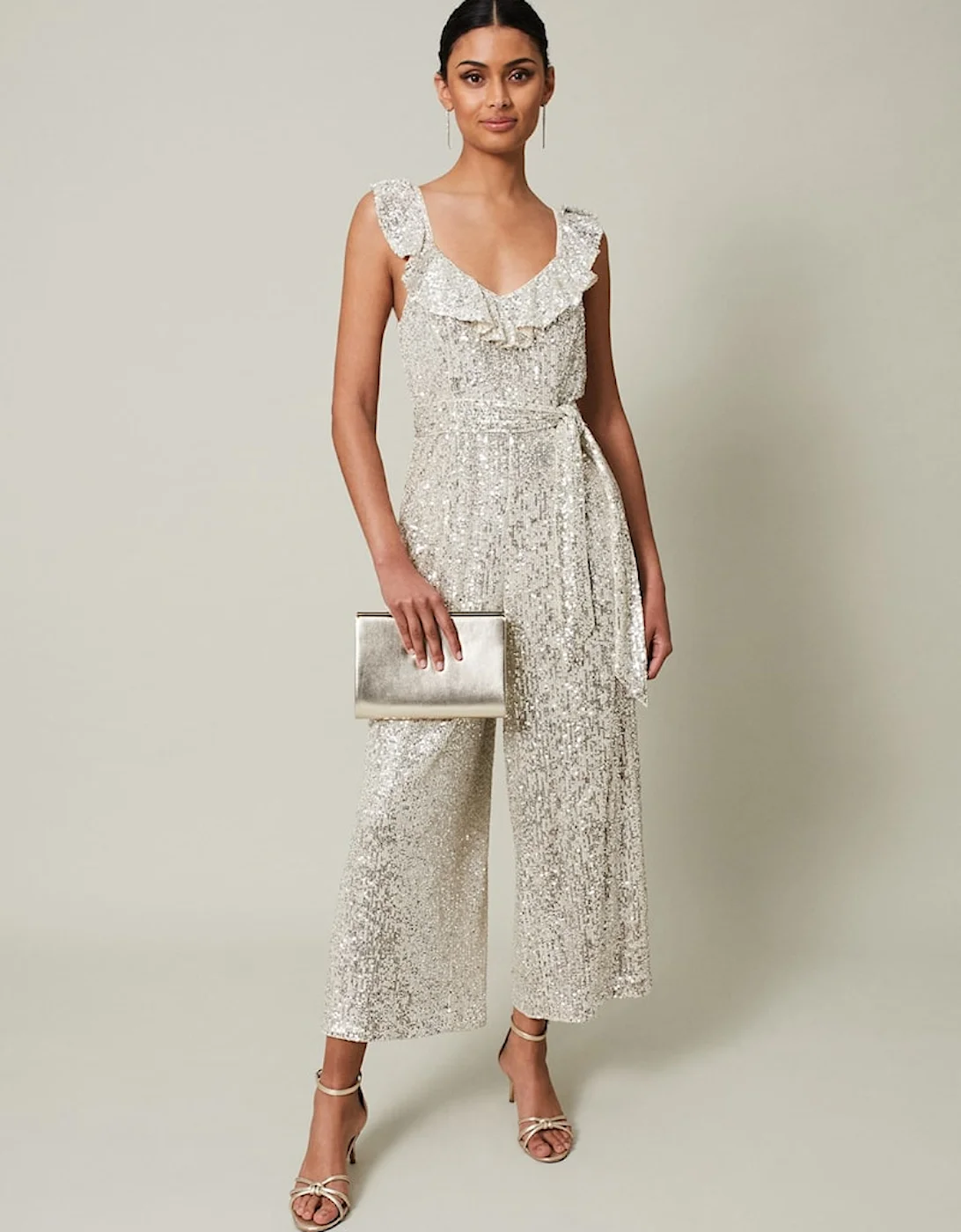 Go for all-out glamour and sophistication with our iconic Tazanna jumpsuit. Designed with head-to-toe silver sequins, our jumpsuit features ruffled detailing on the neckline, a tie belt and it falls to a wide leg silhouette. Drop the shoulders to reveal delicate spaghetti straps and unlock a new style. Wear with a silver clutch bag and heels to your next special event. Regular Fit