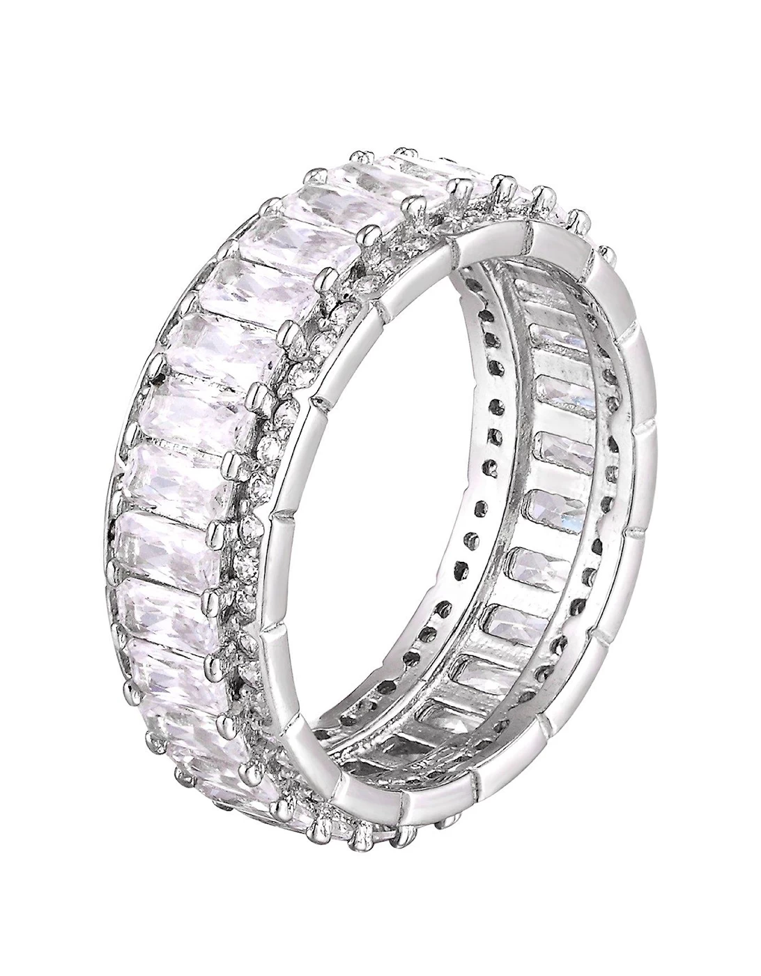 Fashion Jewellery Type: Rings, Metal Type: Silver, Ring Type: Fashion, Stone: Cubic Zirconia, Stone Colour: White, Rhodium plated, Sterling silver, UK size L (small), UK size O (medium), UK Size R (large), Statement eternity ring, Baguette CZ stones, Gift box