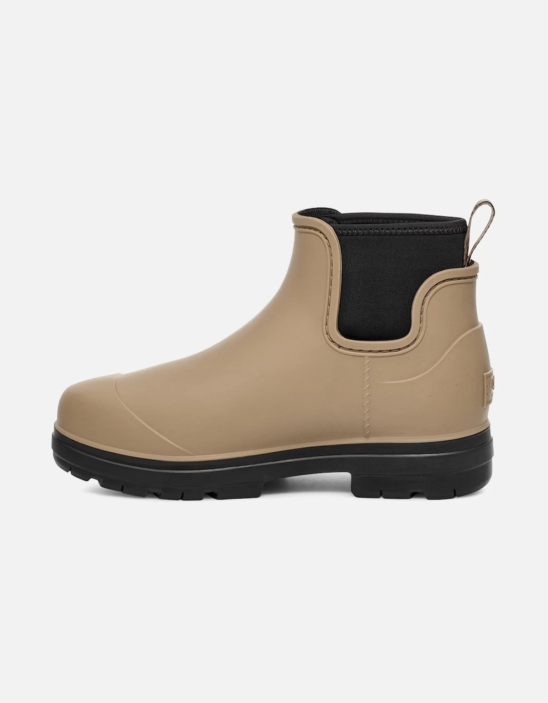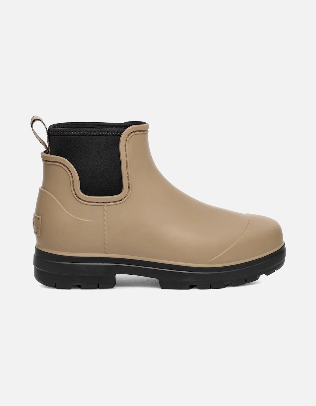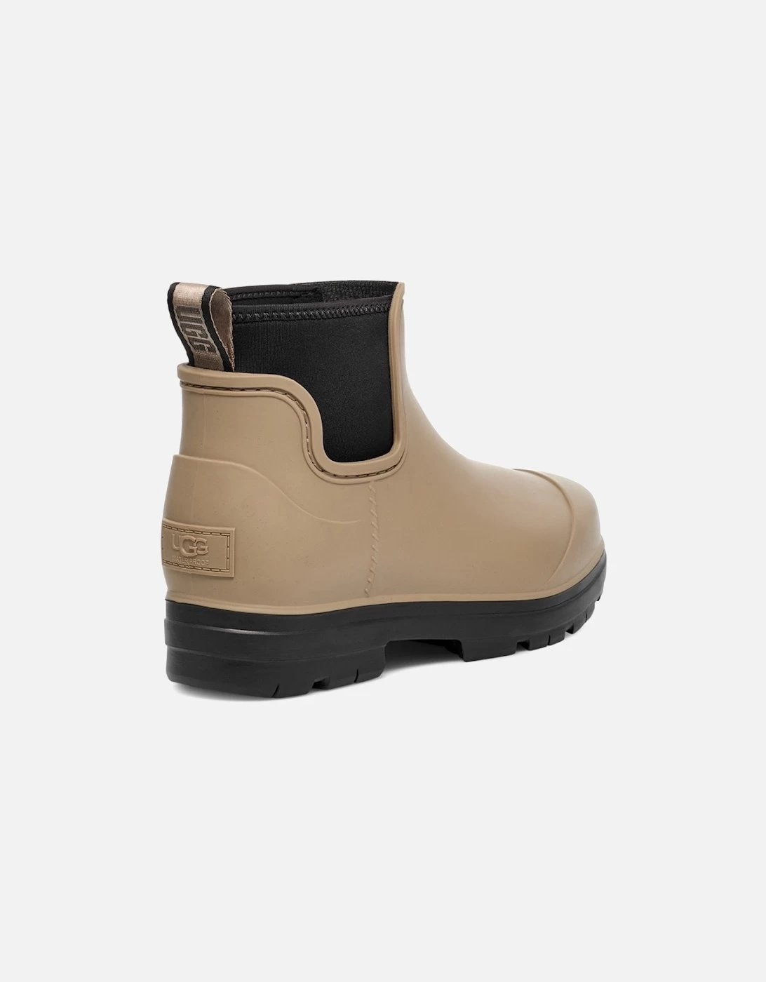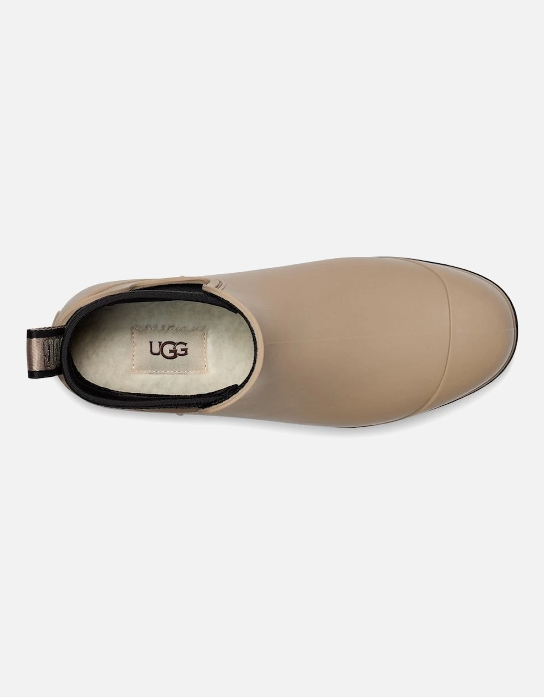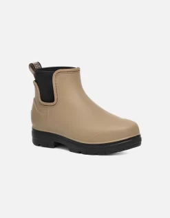 These Ugg Womens Droplet Boots are taupe in colour and they have a rubber upper, EVA outsole and a 60% wool, 40% lyocell lining. The Droplet is a waterproof rainboot that delivers fashion, function, and feel. These boots are slip on and have a rear pull tab, with a neoprene collar. Ugg branding is featured on the pull tab and on the heel, coloured in taupe.