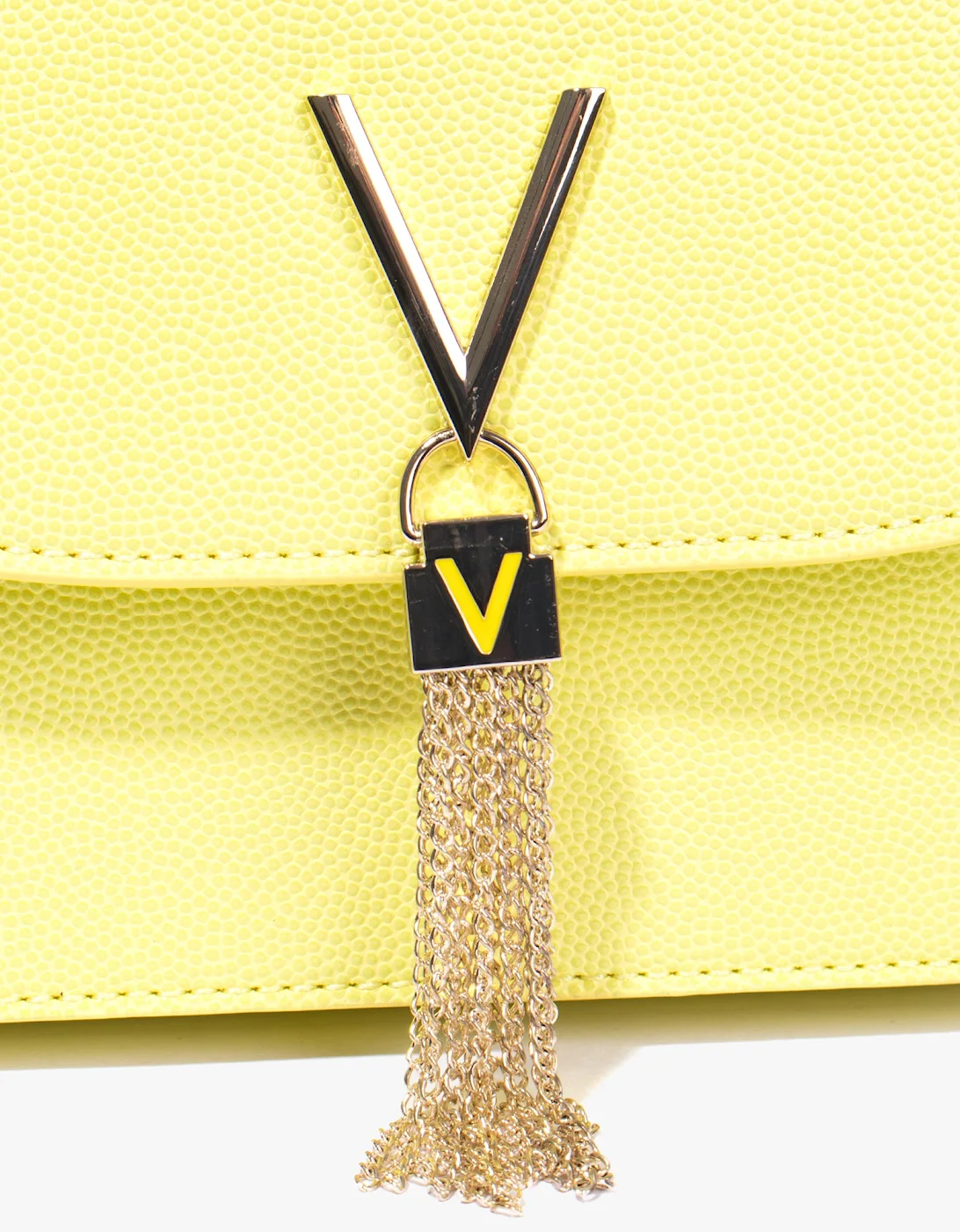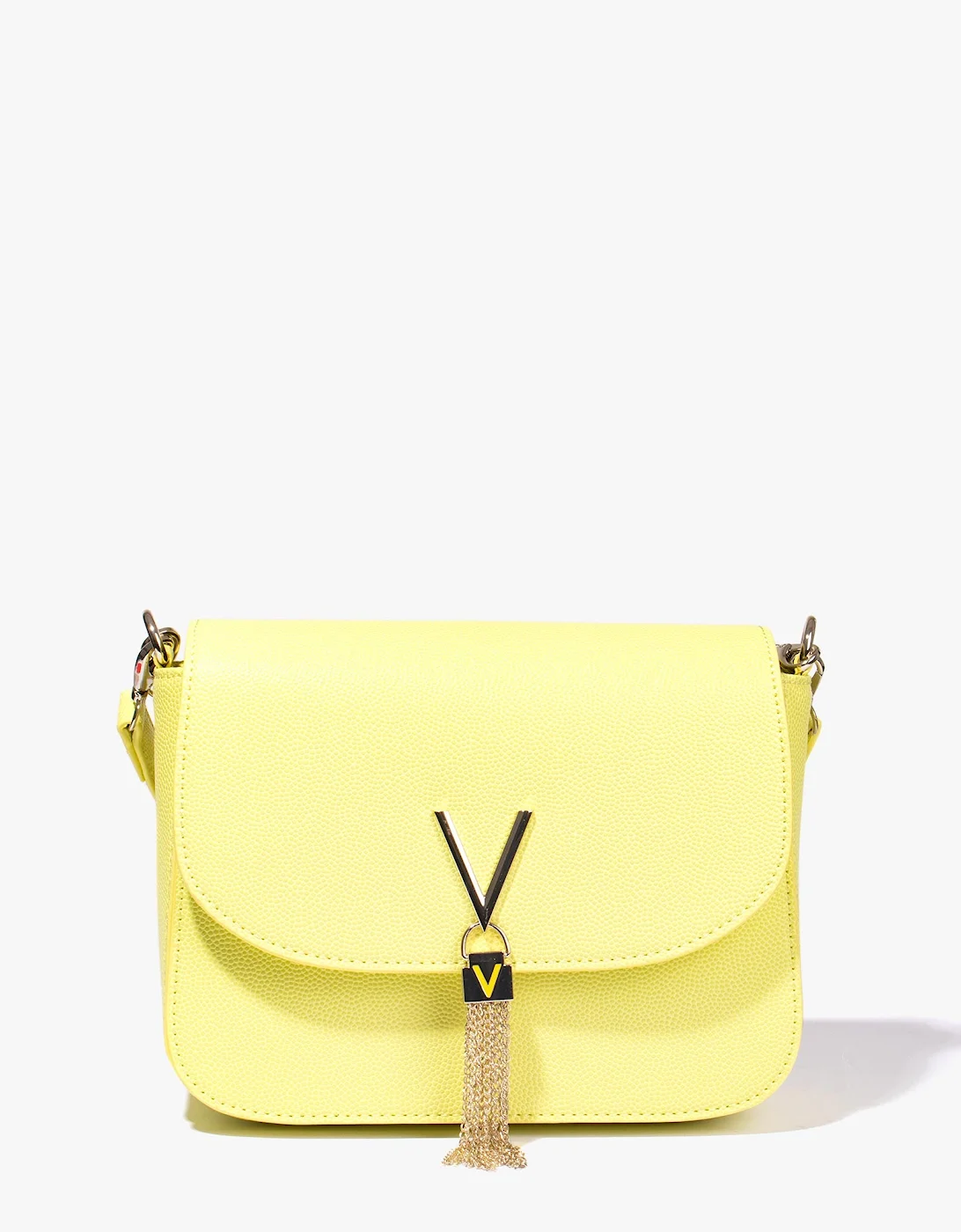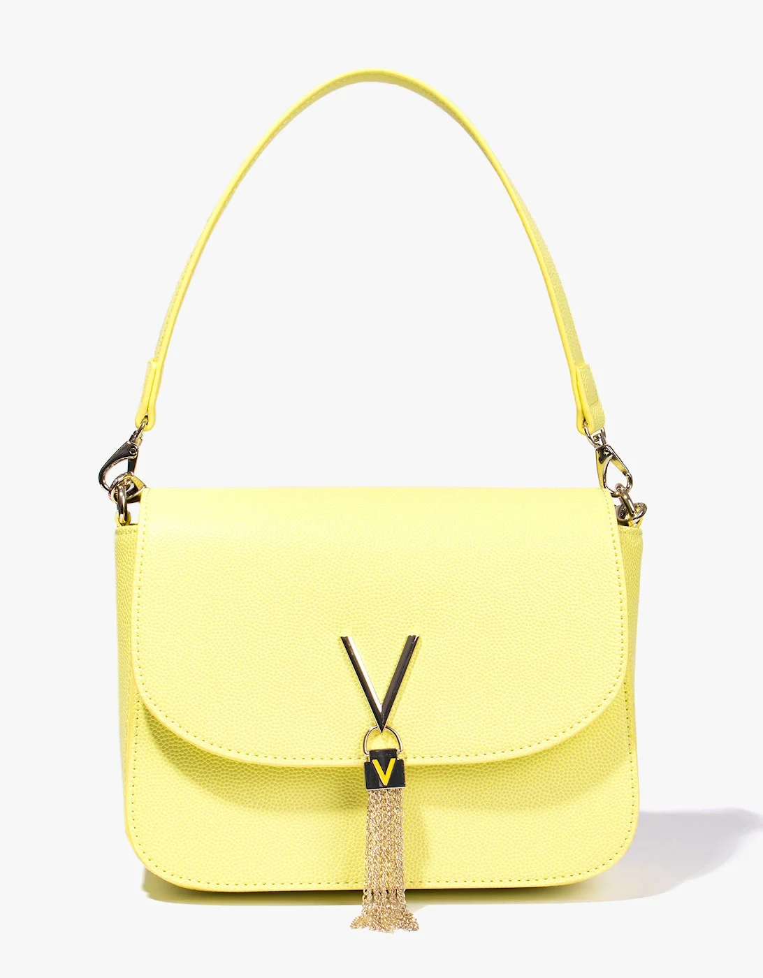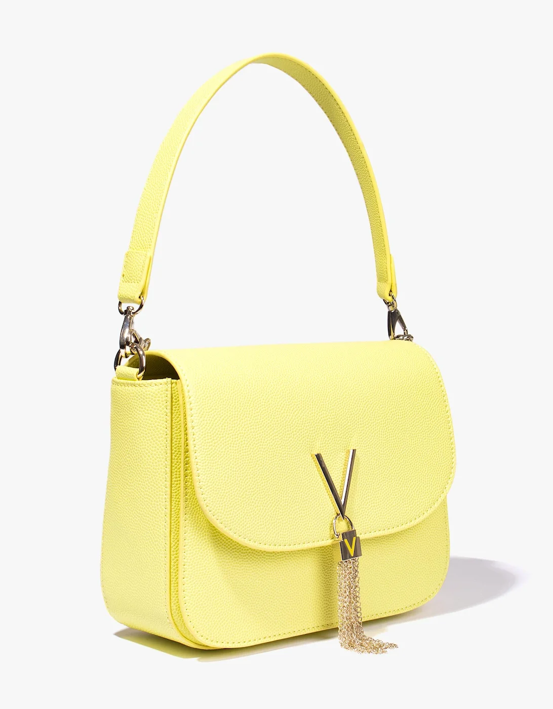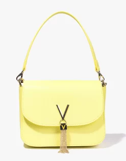 The Divina Shoulder Bag from Valentino by Mario Valentino is a pretty and functional bag that can be used everyday. Featuring an inner zip compartment that can easily hold your phone, wallet and other small essentials, a detachable long metal strap to help transform your look in an instant, as well as a metal V logo to the front with a sparkly tassel detailing, this bag is guaranteed to earn you more than a few impressed glances.