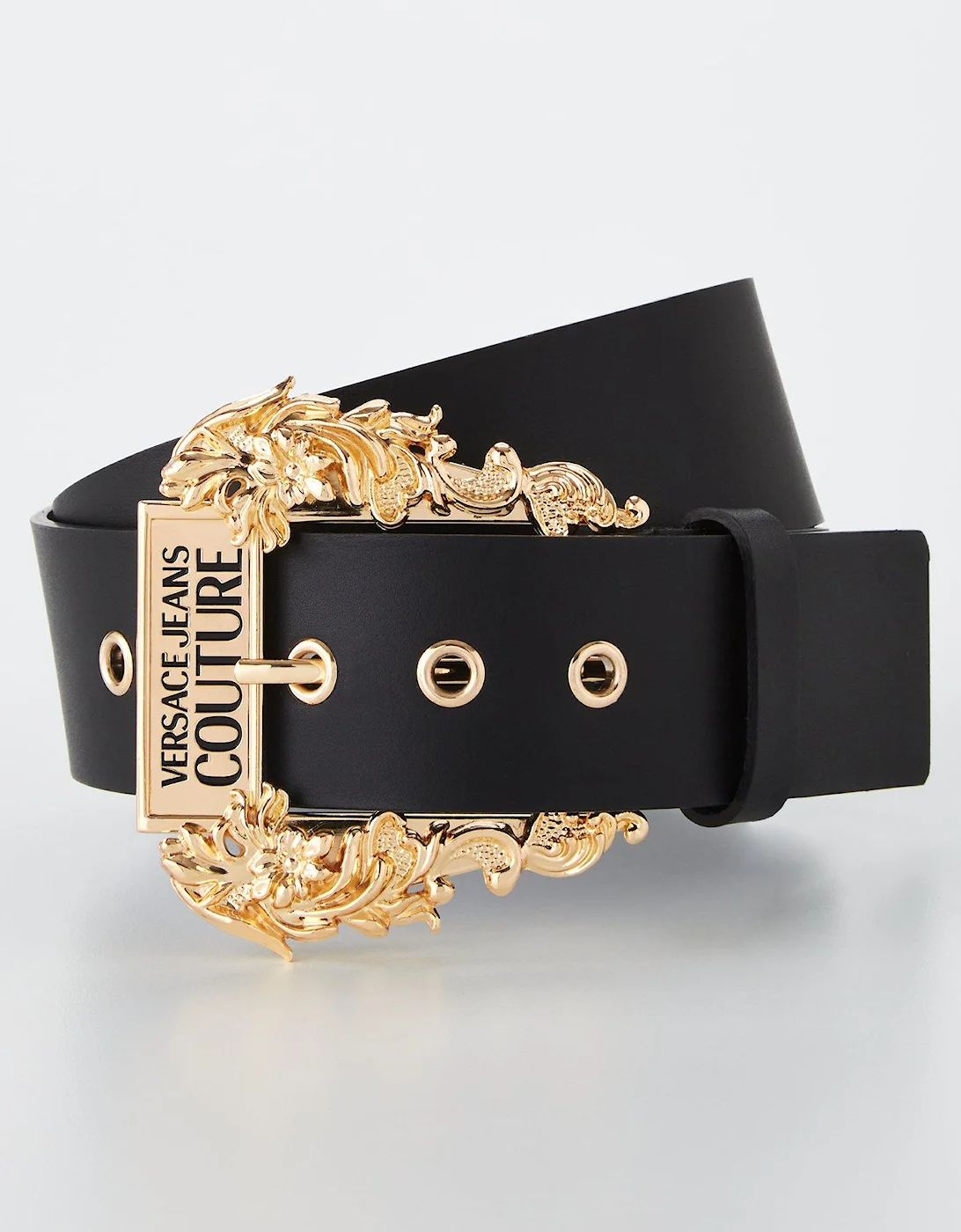 Available in belt lengths 80cm – 90cm, Belt width: 2.5cm , Wide Buckle Belt by Versace Jeans Couture, Black, Made from smooth leather, Chunky gold-tone metal baroque buckle with embossed branding , Five holes for size adjustment, Single belt loop to the buckle, Embossed logo stud to the belt loop , Material Content: 100% Cow Leather, Washing Instructions: Wipe Clean