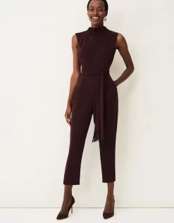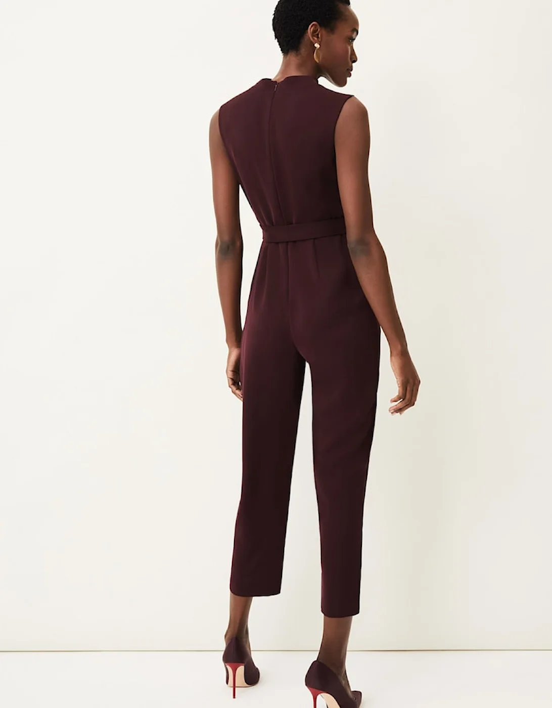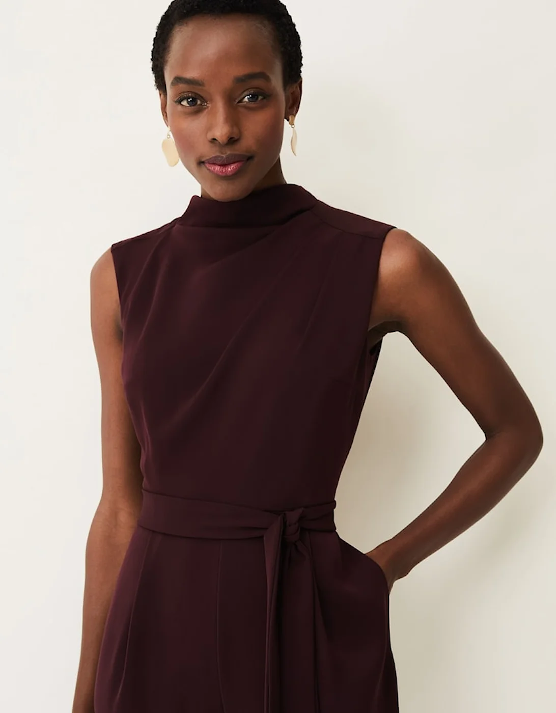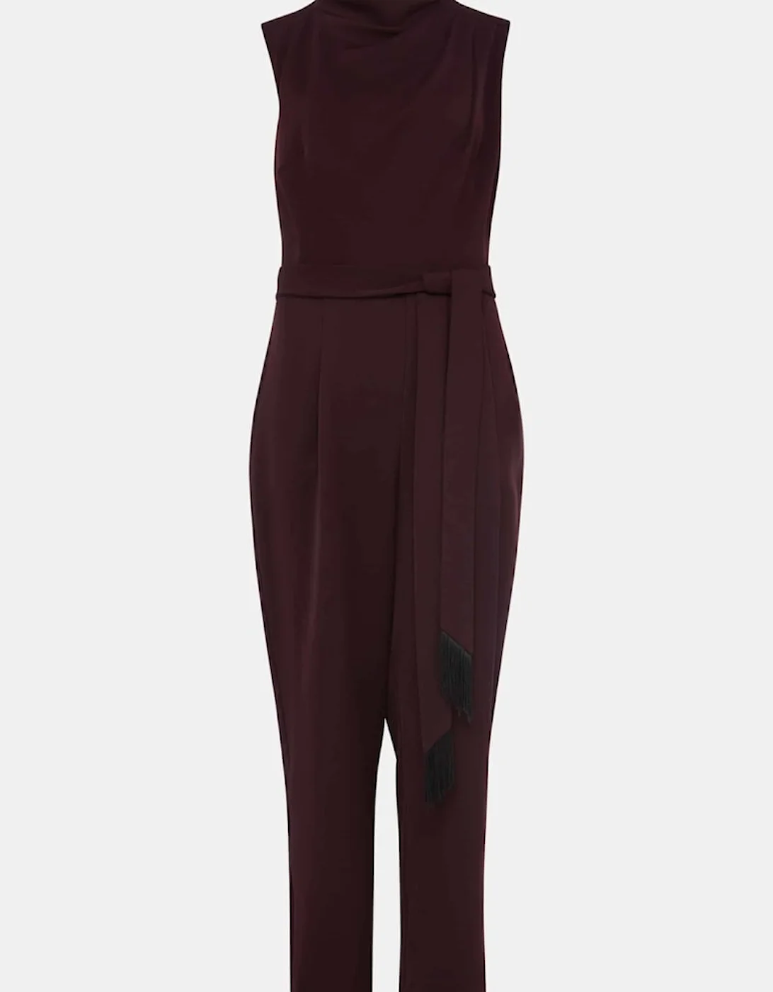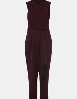 This style is responsibly sourced. This style has been made from recycled polyester, giving materials that would have ended up in landfill a new lease of life. Designed in deep shade of wine, our Zinnia Jumpsuit is designed with a tapered leg and high neckline and finished with a matching waist tie. Perfect for your future RSVPs. Find out more about the sustainable fibres we source here . Model wears UK size 10 and is 5’10/178cm Regular Fit